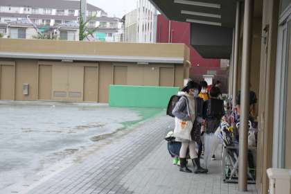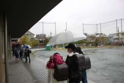 子どもたちが雨の中、下校していきます。
