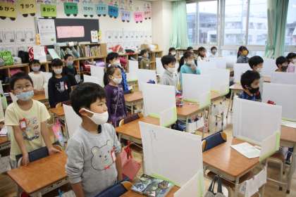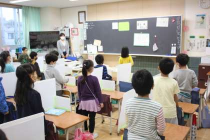 朝の会の中で、松陰先生の声を読み上げる子どもたち。