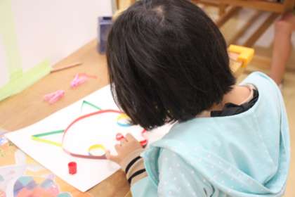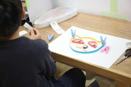 細長いボール紙をまげて形を整え、台紙にはると、半立体の作品ができあがります。