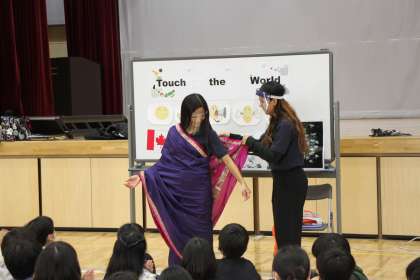 グループごとの体験が終わった後は、全体でインドの伝統衣装「サリー」を見せてもらいました。