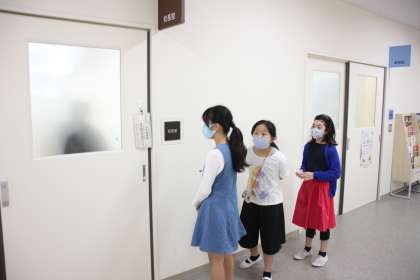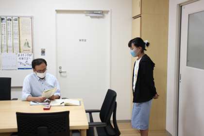 5年生が休み時間に校長室にやってきて、日本語暗唱校長検定を受験しています。