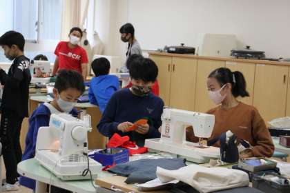 自分たちでセットアップしたミシンで、厚手の布に挑戦!