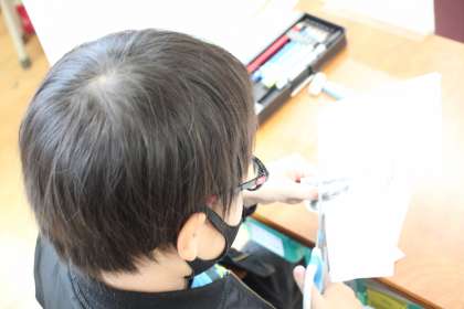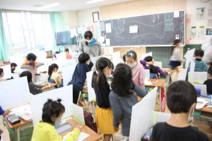 今日は黒板に先生が大きく描いたくじらぐもに、子どもたちが書いた自画像を乗らせます。