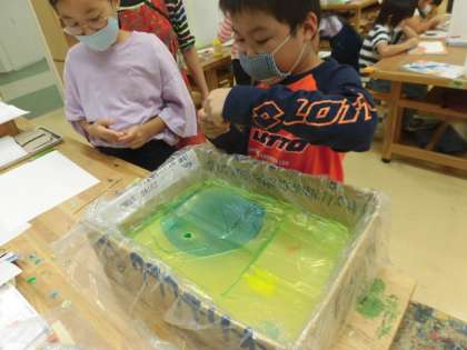 3年生では、絵の具を混ぜ合わせ、きれいなマーブル模様を作りました。一人一人違う模様に子供達も完成を楽しみにしています。