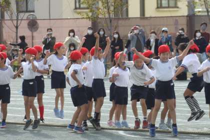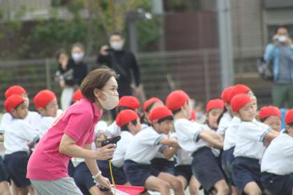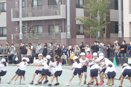 つなに全体重をかけ、力いっぱいに引っ張る2年生。