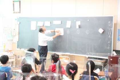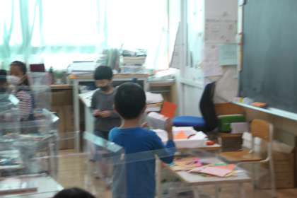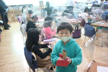 先生の説明通りに画用紙を折り進め、手にはまる形をつくります。