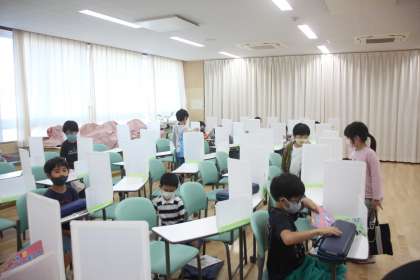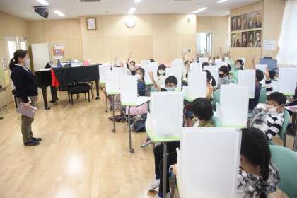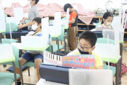 2年生が音楽の時間に鍵盤ハーモニカを吹いています。