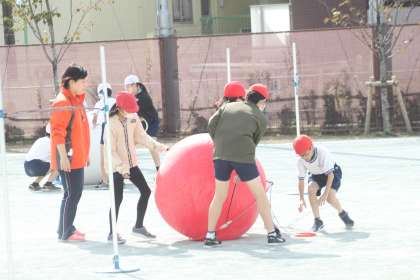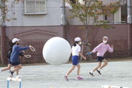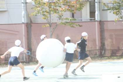 5年生が体育発表会で行う大玉はこびの練習中です。