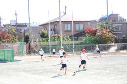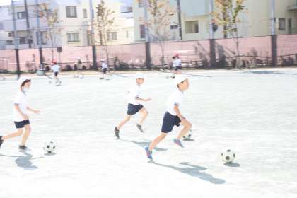 準備体操の後、みんなでトラック一周のドリブルランをしました。