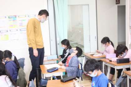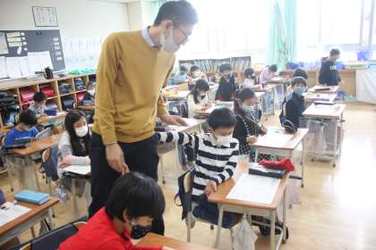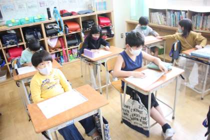数直線を中心に、イラストで分数を表現する2年生たち。