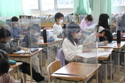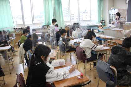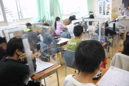 静かにテスト用紙を受け取る5年生。
