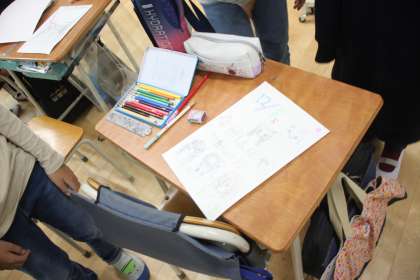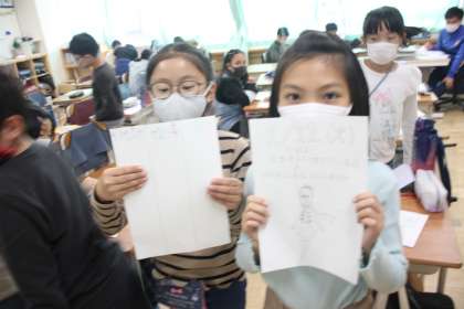 みんなで1枚ずつ描いたものを、束ねて教室に掲示することになっています。