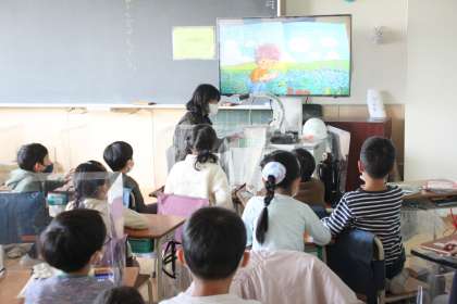 1年生の教室では、担任の先生が書画カメラを使った読み聞かせをしています。