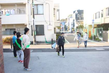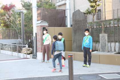 まだ寒い朝の若小正門に、元気な5年生の声が響きます。