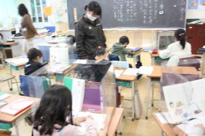 説明文を読んで、はしご車の形を、ノートに絵で表現する1年生。