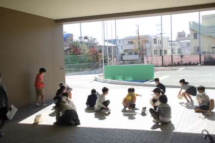 3年生が鏡を手に、屋外に出かけていきます。
