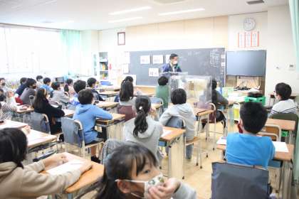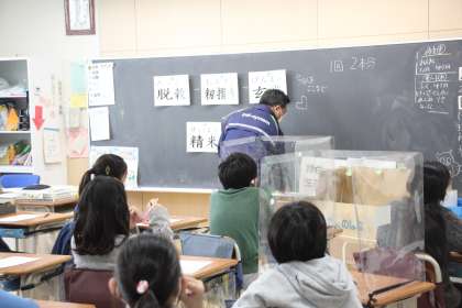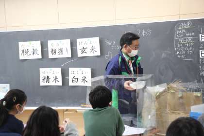 5年生が外部講師をお招きして、脱穀と籾摺りについての学習をしました。