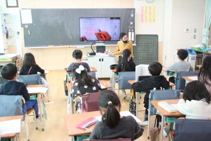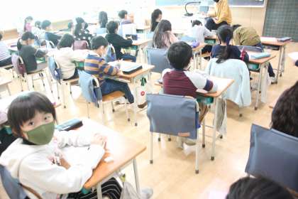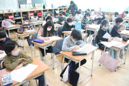 2年生が算数の時間にかけ算九九の100ます計算に挑戦中〜!