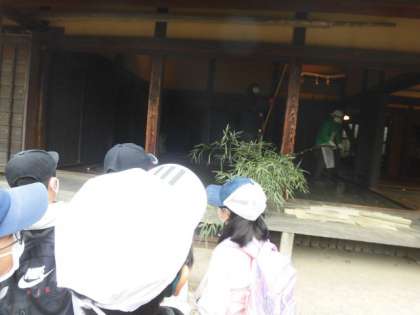 大根掘りの後で次大夫堀公園に行き、民家園などを見に行きました。すす払いをしていたり、鍛冶屋で鉄を付く様子を見たりと昔ながらの生活の様子に児童も興味津々な様子でした。