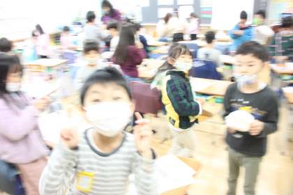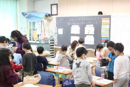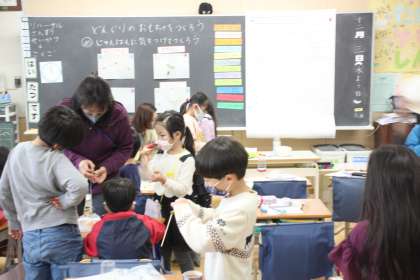 1年生が手順に沿ってどんぐりを使ったおもちゃをつくっています。