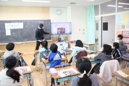 4年生の教室にALTのアミン先生が登場!