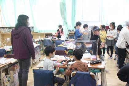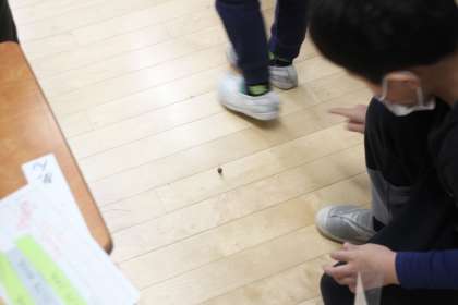 6年生と一緒に、羽根木公園にどんぐり拾いに行った1年生。