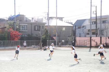 ボールけり遊びの前に、おにごっこで体を温める2年生。