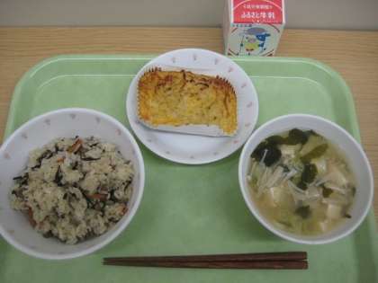 ひじきごはん 切干大根の卵焼き 豆腐とわかめのみそ汁 牛乳