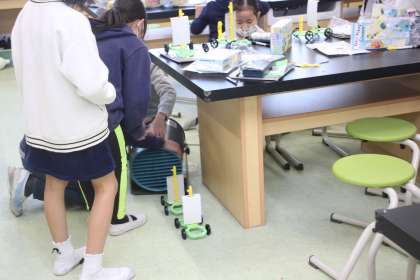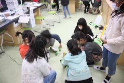 送風機を駆使して、帆のついた車を、速く走らせるための工夫について考えました。
