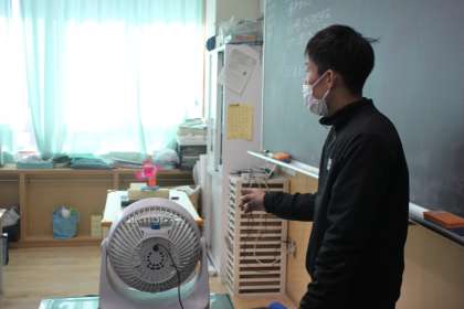 実際に目の前でサーキュレーターを使いながら確かめる先生。