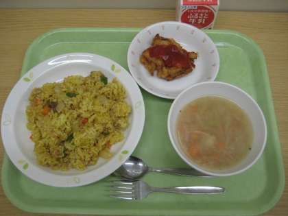 ツナピラフ 大豆とコーンのフリッター コンソメスープ 牛乳