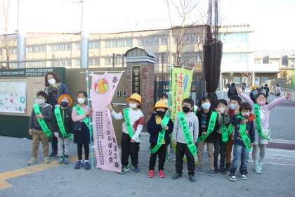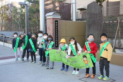 大きなタスキを肩にかけ、元気いっぱいに声をはる1年生。