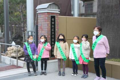 若小のアイドル、1年生たちが、正門で元気いっぱいのあいさつをしてくれています。