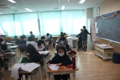 4年生のクラスで通知表が渡されています。