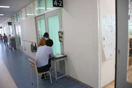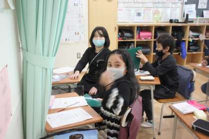 静かに順番を待つ4年生。
