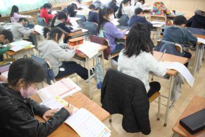 真新しいのドリルに書き込む3年生。