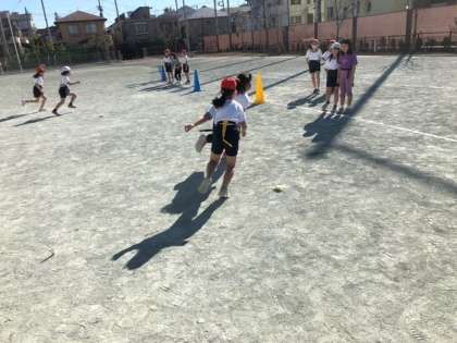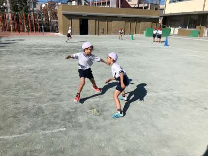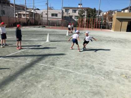 タグラグビーにつながる、しっぽとりを行いました。1対1の真剣勝負です。攻める側は、とられないように!守る側は、タグを取るぞ!という意識で取り組みました。白熱した体育になりました。