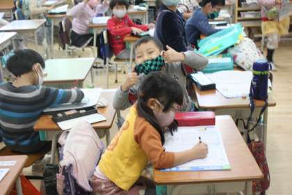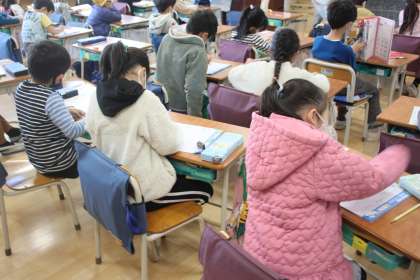 お手本をみて、丁寧に書き進める1年生。