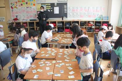 ソーシャルディスタンスを保って、カルタに向き合う2年生。