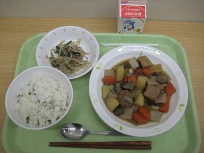 わかめごはん 五目うま煮 ほうれん草の磯和え 牛乳