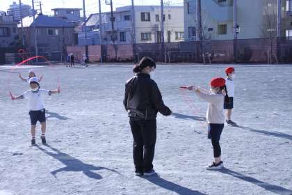 1年生が体育の学習で、短なわとびに取り組んでいます。