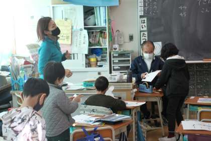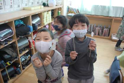 1年生が画用紙と竹ひごで、ペープサートづくりをしています。