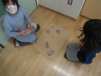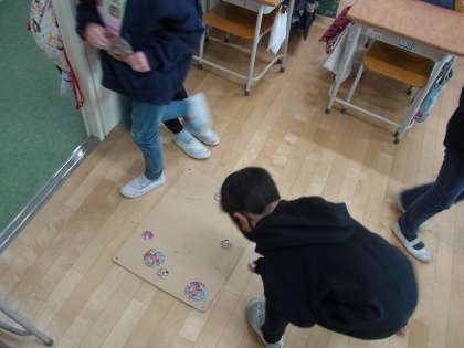 図工の画板の上で、ぱちんと投げる練習をしました。
