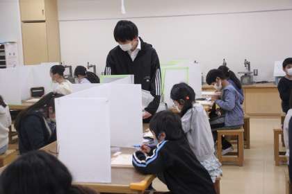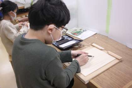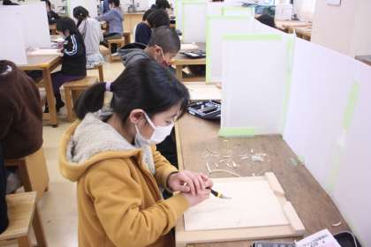 先生に指導されたように、安全に気を付けて彫刻刀を手にする4年生。