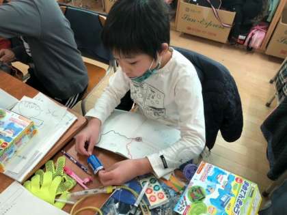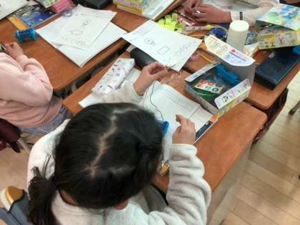 理科の授業では、明かりの学習をしています。今日は、導線を乾電池にどのようにつなげれば明かりがつくのかを考え、実験に取り組みました。明かりがつくきまりについて、気づくことができました。
