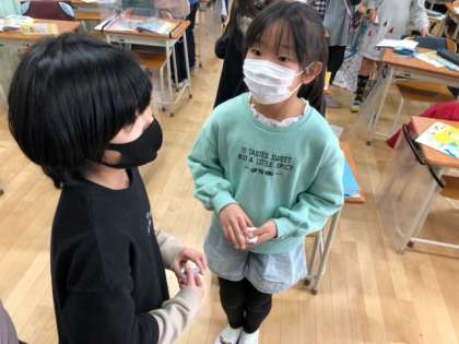 普段使ったり、聴きなれない言葉に触れたりして相手が何を伝えようとしているのか、子どもたちなりに考えて活動をしています。今回は、相手に何が欲しいのか伝え、カードをもらうやり取りを学習しました。