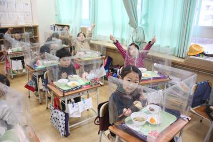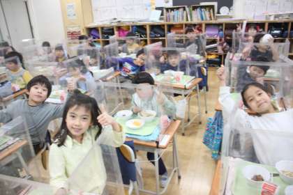 1年生の教室では給食の真っ最中。