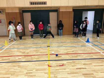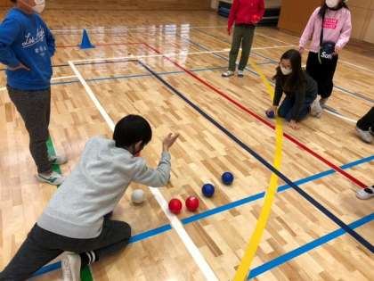 パラリンピック種目である「ボッチャ」を体験しました。一人一球ずつボールをもち、目標に向け真剣に投げました。また、投げた後も見て楽しめる素晴らしいスポーツです。