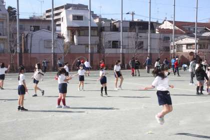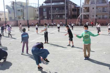 中休みの校庭は、短なわとびに取り組む子どもたちでいっぱい!