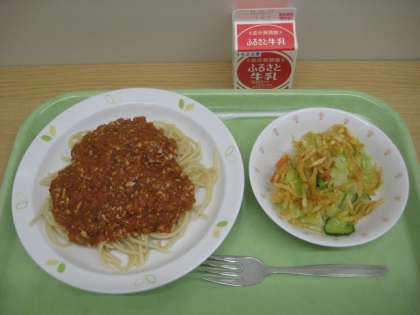 スパゲッティヘルシーミートソース じゃがいものバリバリサラダ 牛乳